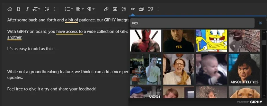 After some back-and-forth and a bit of patience, our GIPHY integration is now live. You can easily add GIFs to any part of ROFLMAO where they're supported.